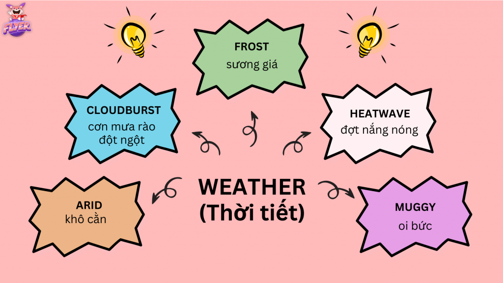 | under the weather | mệt mỏi, không khỏe | It’s been raining a lot these past few days, I’ m under the weather. Mấy hôm nay trời mưa nhiều, tôi cảm thấy khó chịu. |