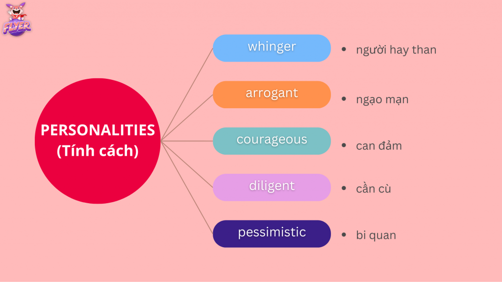 | personality | n | /ˌpɜrsəˈnælɪti/ | nhân cách, cá tính | She might not be rich but she has a great personality. Cô ấy có thể không giàu có nhưng cô ấy có nhân cách tốt đẹp. |