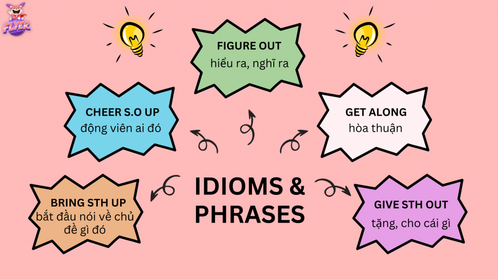 | figure out | hiểu ra | It wasn’t hard to figure out what to buy for my new home. Không quá khó để nghĩ ra những thứ cần mua cho nhà mới. |