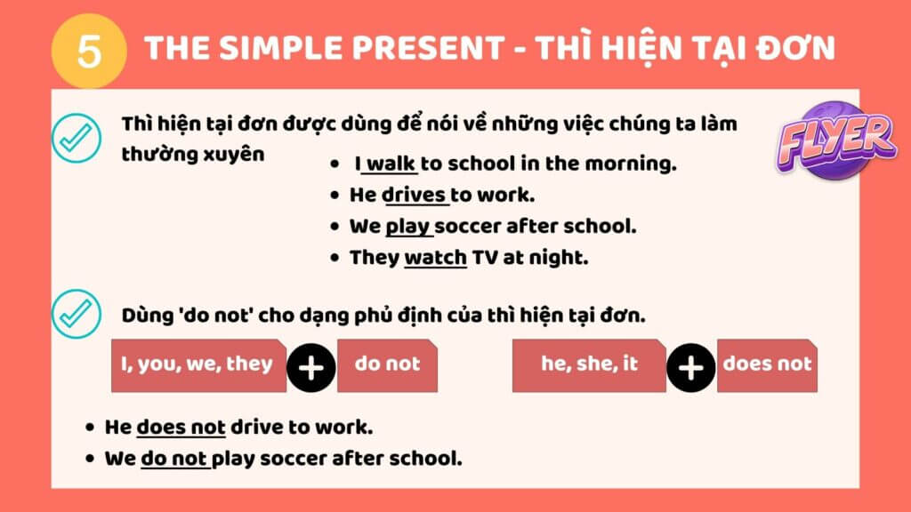 | Phủ định | S + do/ does + not + Vdo not = don’t does not = doesn’t | I don’t go to school on foot. Tôi không đi bộ đến trường. He doesn’t work on the weekend. Anh ấy không làm việc vào cuối tuần. |