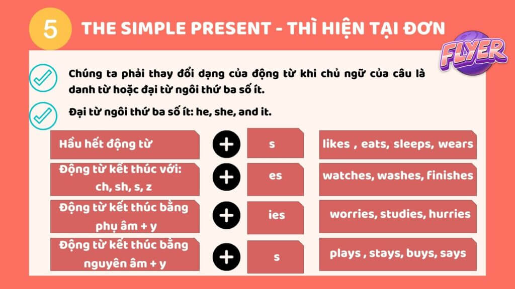 | Còn lại → Thêm -s | enjoy → enjoys sing → sings eat → eats |