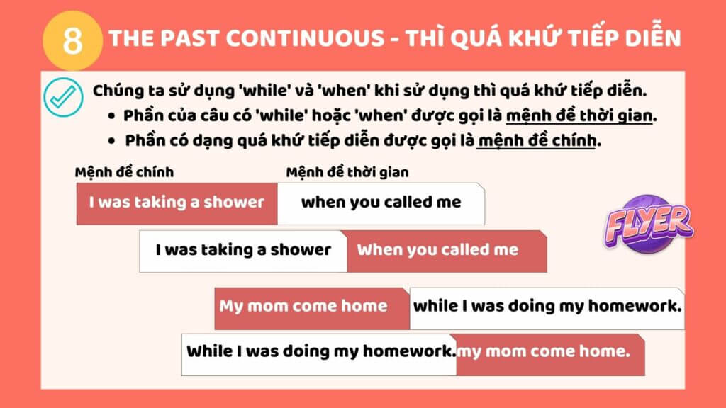 Ngoài ra, thì quá khứ tiếp diễn thường sử dụng “while” và “when” để mô tả hai hành động diễn ra song song trong quá khứ. Dựa vào mệnh đề của “while” và “when”, con có thể chia động từ đúng với thì.