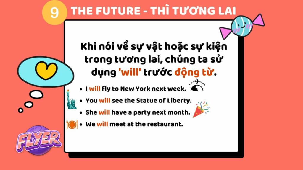 Thì tương lai được dùng để diễn tả những kế hoạch, quyết định, dự đoán hoặc lời hứa sẽ làm điều gì trong tương lai. Hai dạng chính “will” và “be going to” của thì tương lai có cách sử dụng khác nhau:
