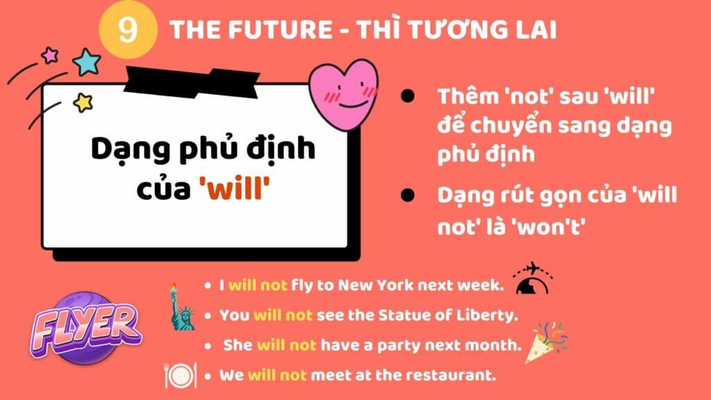 | Phủ định | S + will + not + Vwill not = won’t | Lisa and Jenny won’t buy a new car. Lisa và Jenny sẽ không mua một chiếc xe mới. |