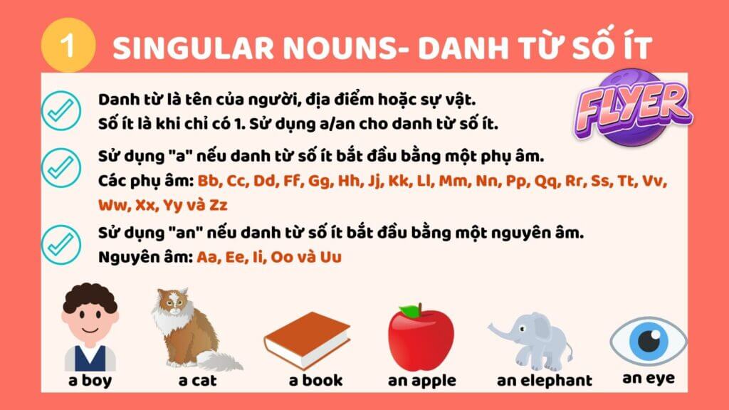 Danh từ là những từ chỉ về con người, địa điểm, sự vật hoặc hiện tượng nào đó. Một danh từ được gọi là danh từ số ít khi chỉ về MỘT người, một địa điểm, một sự vật hoặc một hiện tượng cụ thể.