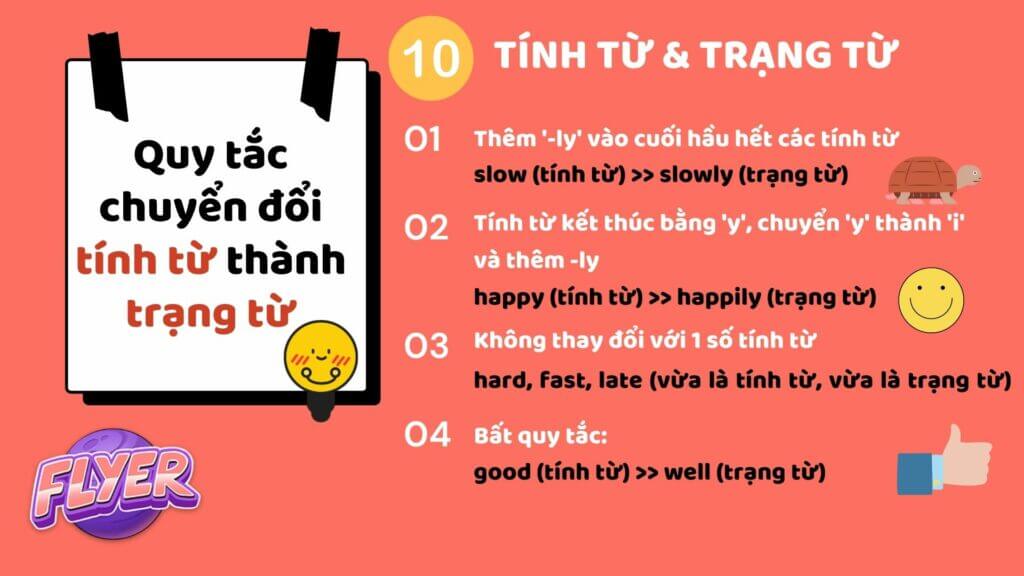 | Tính từ kết thúc bằng đuôi -able hoặc -ible → Đổi -e thành -y | horrible → horribly enjoyable → enjoyably |