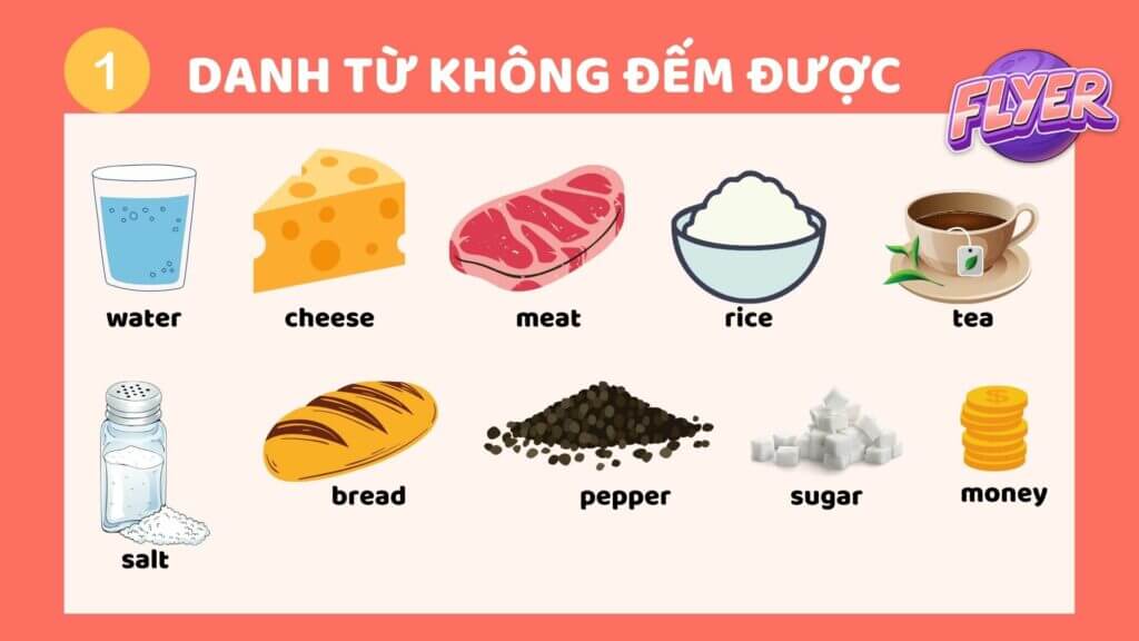 Ví dụ: rice, sugar, butter, water, money, bread, meat, milk, coffee,…