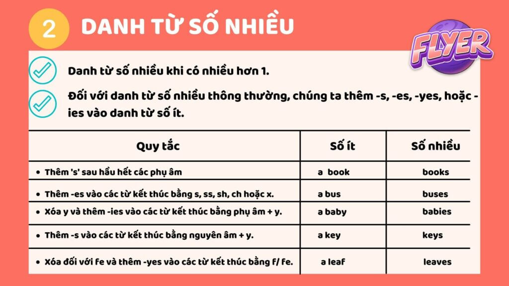 Quy tắc thêm “-s”, -es” để tạo danh từ số nhiều: