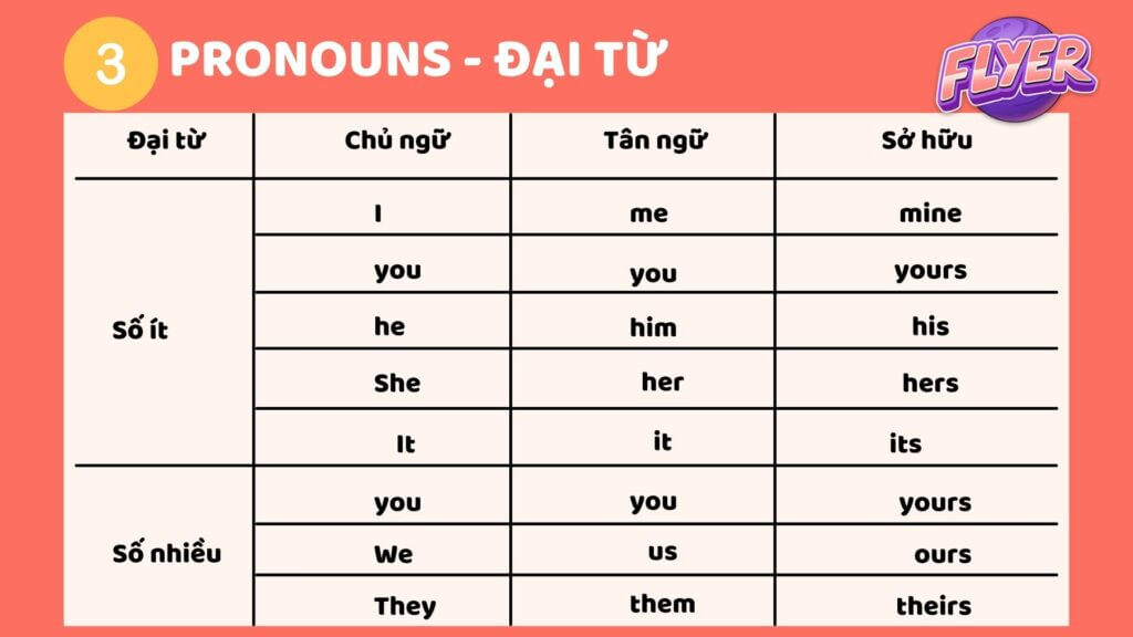 | Số ít | Ngôi thứ nhất (người nói) | I | me | mine |