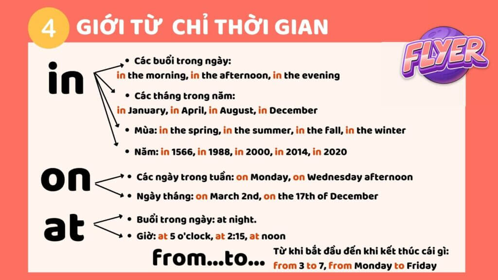 Cách dùng các giới từ chỉ thời gian “at”, “in” và “on”: