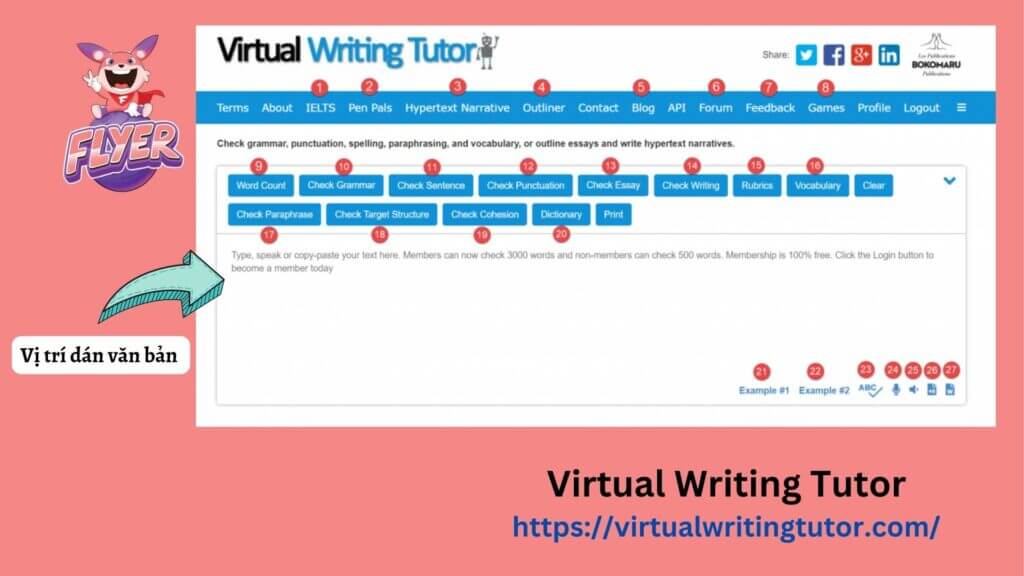 Virtual Writing Tutor là một trang web kiểm tra ngữ pháp trực tuyến miễn phí. Bằng cách nhập văn bản mà bạn muốn kiểm tra ngữ pháp vào khung văn bản, Virtual Writing Tutor sẽ giúp bạn chỉ ra các lỗi sai (nếu có), sửa lỗi và cải thiện cách diễn đạt sao cho hợp lý và tự nhiên nhất.