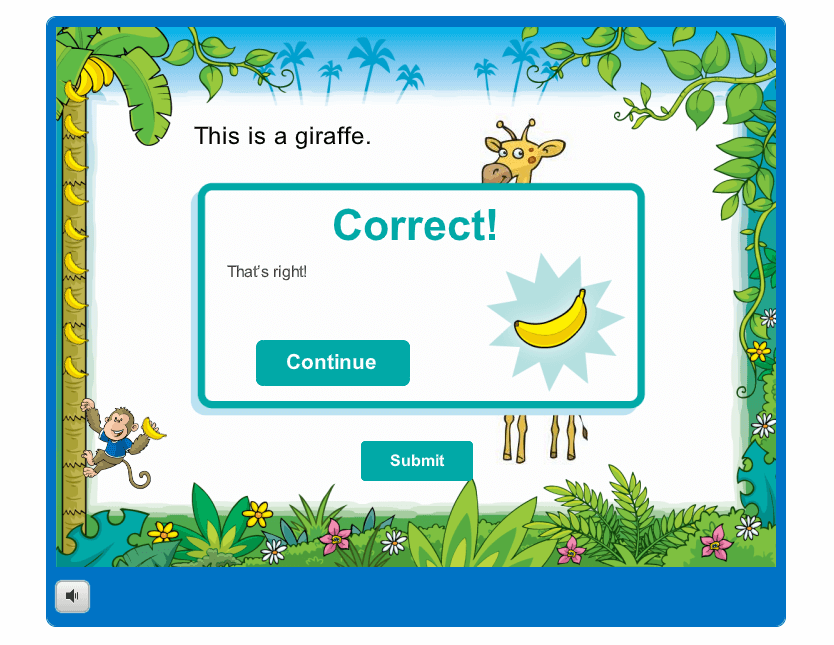 Bài tập từ vựng với đồ họa dễ thương về tên các loài vật quen thuộc trong tiếng Anh cho trẻ làm quen như giraffe, goat, v..v. Đáp án sẽ xuất hiện ngay sau khi bé chọn xong một câu và nhấn vào nút “submit”.