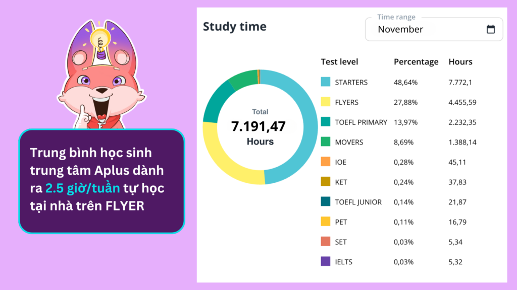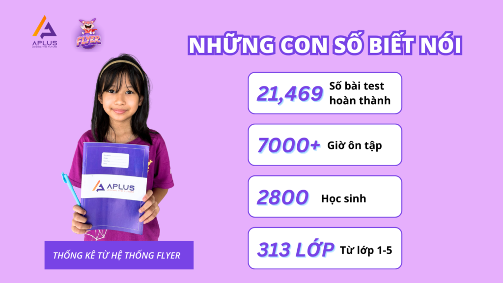 Trong quá trình hợp tác, chỉ riêng tháng 11, hệ thống FLYER ghi nhận 21,469 số bài test hoàn thành với 313 lớp tiểu học. Sự đầu tư thông minh của Aplus đã được thể hiện rõ nhất thông qua các con số dưới đây: