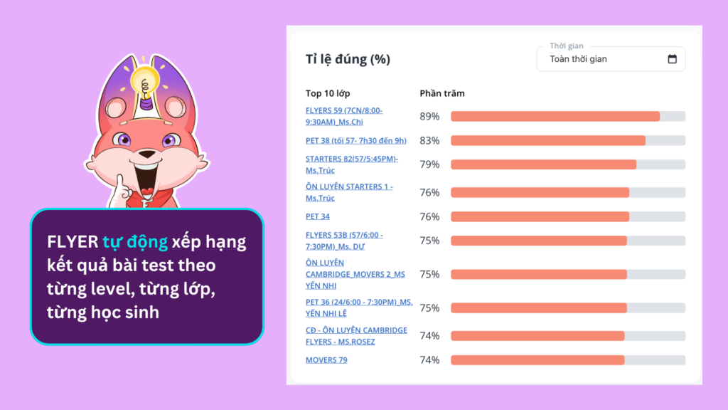 Cụ thể hơn, kết quả của từng bài test sẽ được xếp hạng và phân loại dựa theo từng lớp, từng học sinh. Nhờ đó, giáo viên Aplus có thể đánh giá nhanh chóng năng lực học sinh, quản lý trung tâm có thể đánh giá khách quan nhất chất lượng giảng dạy của giáo viên.