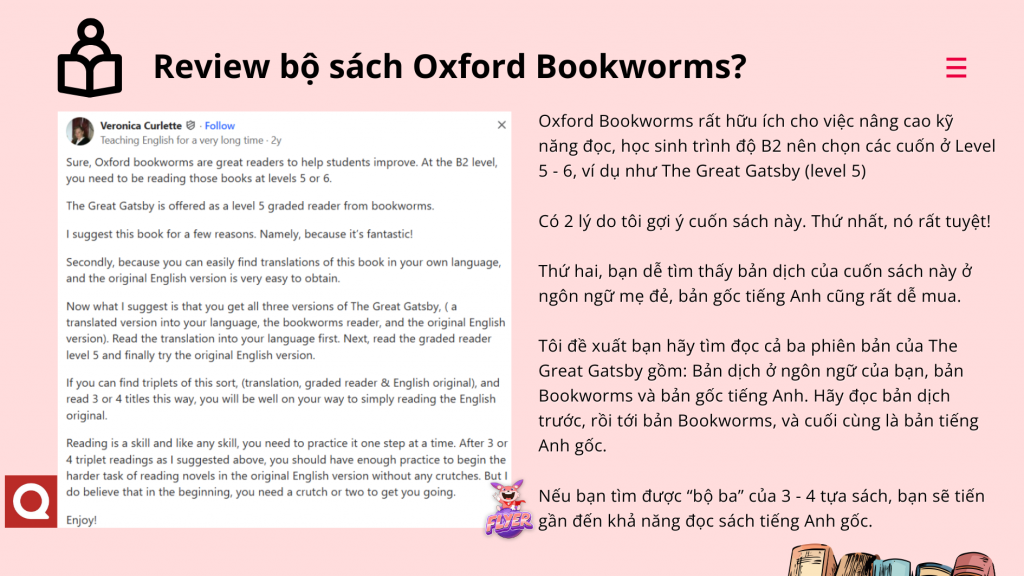 - Trả lời cho câu hỏi “Will Oxford Bookworms be a good idea to improve my English? My English level is B2” (Liệu bộ sách Oxford Bookworms sẽ giúp tôi cải thiện tiếng Anh chứ? Trình độ của tôi là B2), một giáo viên tiếng Anh cho hay: