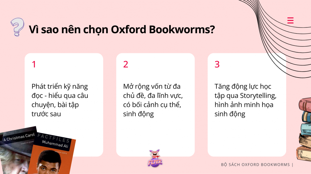 Bộ sách Oxford Bookworms sẽ phá tan mọi định kiến như “khó, dễ nản, nhàm chán” về đọc – hiểu tiếng Anh của học sinh bằng những câu chuyện rất đỗi thú vị và mới lạ. Bố cục thiết kế đặc biệt và hệ thống cấp độ rõ ràng quyết định phần lớn giá trị của bộ sách và biến chúng trở thành tài nguyên dạy – học nổi tiếng bậc nhất. Mời thầy cô cùng FLYER khám phá về “thực hư” hiệu quả của bộ sách Bookworms và tìm hiểu lý do vì sao đây là học liệu không thể thiếu trong tủ sách nhé.