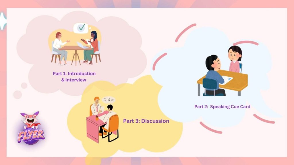 Bài thi Speaking IELTS kéo dài khoảng 11-14 phút và được chia thành ba phần chính: