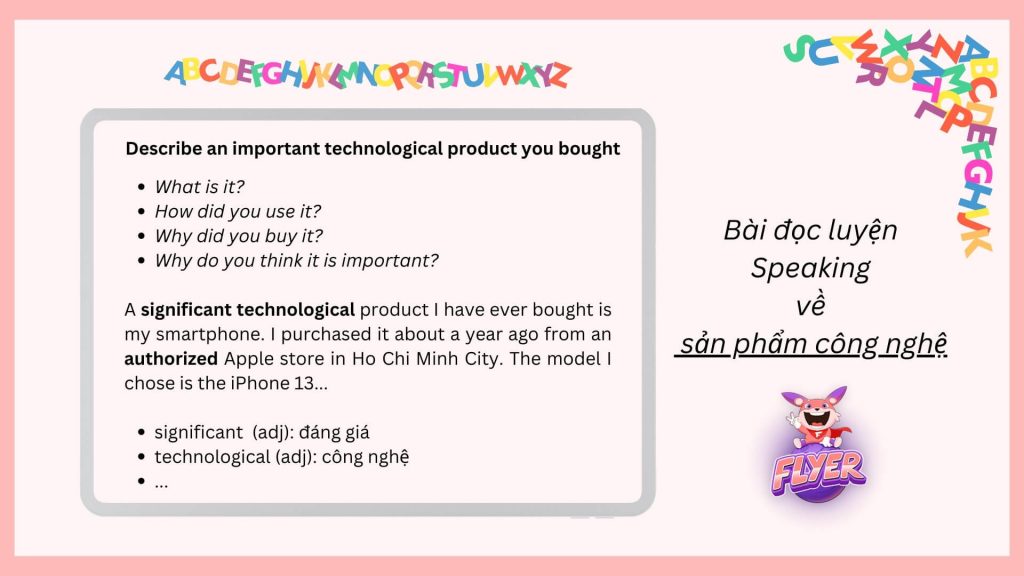 A significant technological product I have ever bought is my smartphone. I purchased it about a year ago from an authorized Apple store in Ho Chi Minh City. The model I chose is the iPhone 13, which is known for its advanced features and sleek design.
