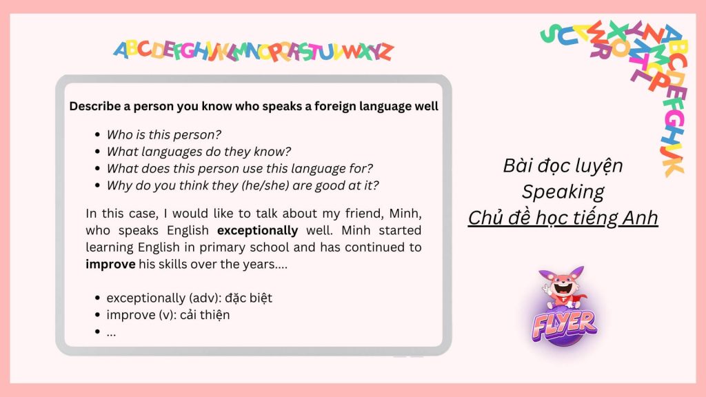 In this case, I would like to talk about my friend, Minh, who speaks English exceptionally well. Minh started learning English in primary school and has continued to improve his skills over the years. He is now fluent and can communicate effortlessly with native speakers.