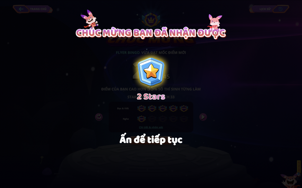 Để tăng động lực cho học sinh trong quá trình ôn tập, sau khi hoàn thành bài, các bạn học sinh sẽ nhận được số sao theo điểm số tương ứng của bài. Ví dụ như, nếu con làm đúng 90-100%, con nhận được 3 sao.