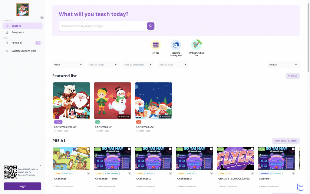 Chào đón năm Ất Tỵ, ứng dụng triệt để công nghệ AI (Trí tuệ nhân tạo) và với mục tiêu giúp học sinh đạt được điểm cao, làm quen nhanh chóng với các dạng đề tiếng Anh trong các kỳ thi lấy chứng chỉ quốc tế, đội ngũ FLYER đã cập nhật thêm các tính năng mới trong Quý 1/2025 này. Ngoài ra, dành riêng cho giáo viên và trung tâm Anh ngữ, FLYER đã nâng cấp một số tính năng mới hỗ trợ thầy cô trong công tác giảng dạy.