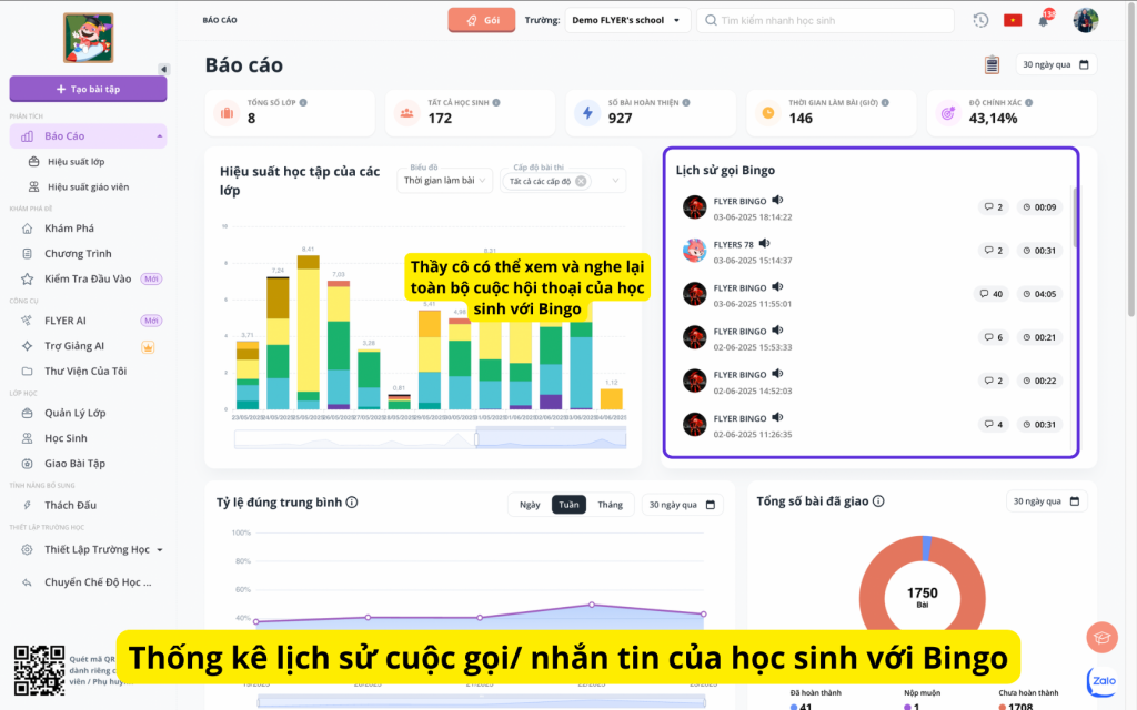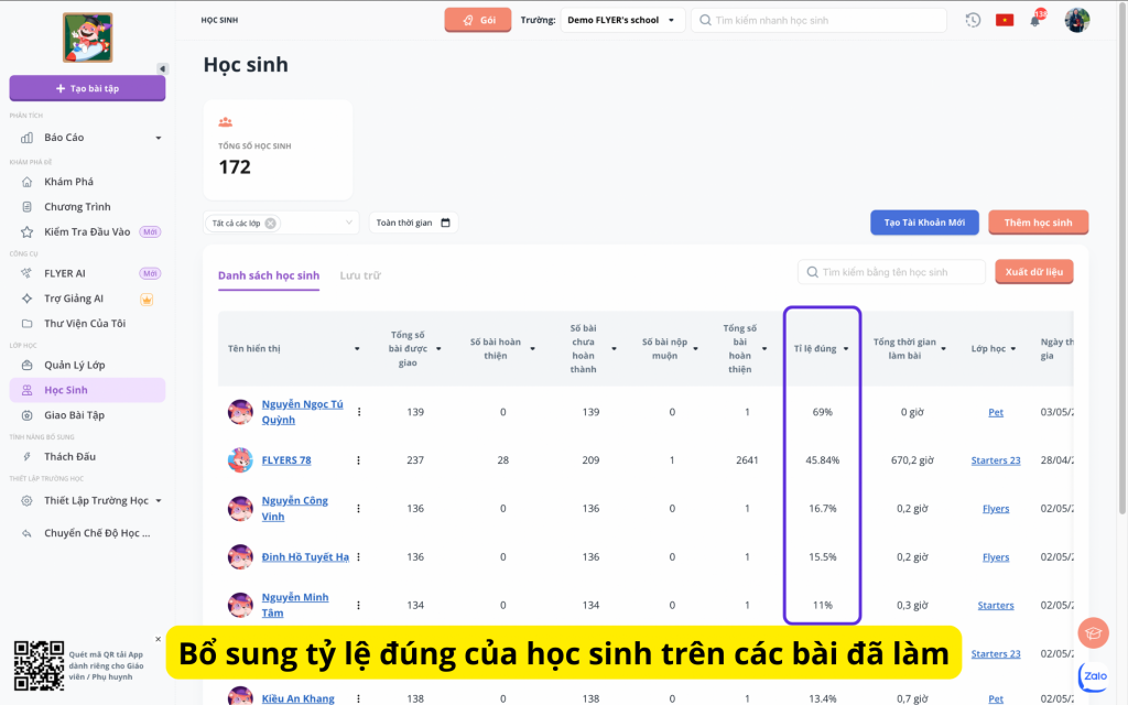 Đối với các thầy cô đang quản trị học sinh trên FLYER Teacher, các báo cáo đã được nâng cấp. Cụ thể, hệ thống FLYER thống kê chi tiết tỷ lệ đúng trên các bài làm của từng bạn học sinh. Từ đó, thầy cô có thể đánh giá được khả năng tiến bộ của các bạn học sinh qua các bài kiểm tra được giao.