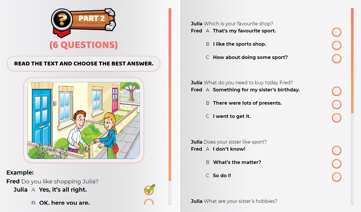 | Part 4 | Nghe 5 đoạn hội thoại riêng biệt. Mỗi đoạn có 1 câu hỏi có dạng trắc nghiệm 3 lựa chọn là 3 bức tranh. Đánh dấu vào bức tranh đúng. | – Nghe toàn bộ đối thoại trước khi quyết định câu trả lời vì các hình ảnh đều được nhắc đến trong bài nghe. – Thường có khá nhiều từ vựng được đề cập trong phần này của bài thi. Do đó, thí sinh phải làm quen với tất cả các từ trong danh sách từ vựng Pre A1 Staters và A1 Movers. | Nghe thông tin cụ thể thuộc nhiều dạng khác nhau |