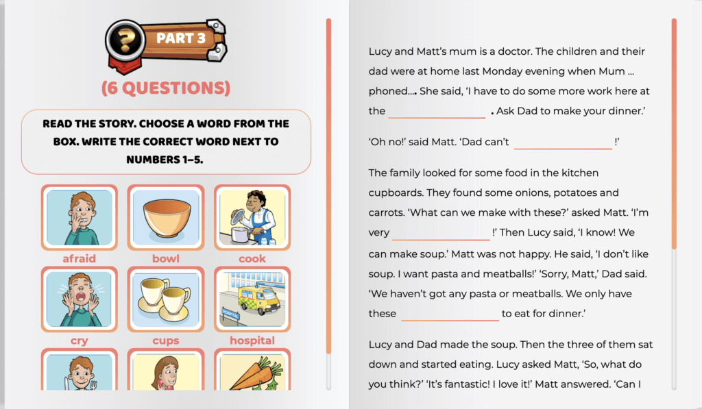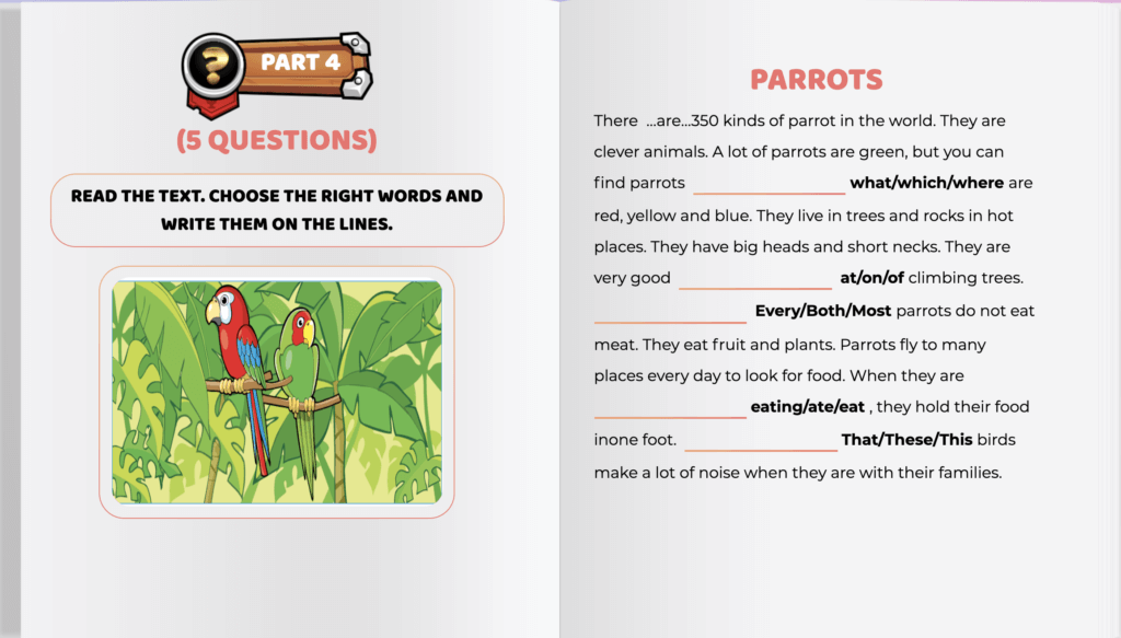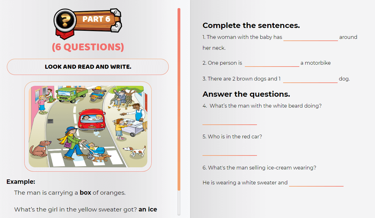 | Part 6 | Nhìn 1 bức tranh, hoàn thành câu và trả lời câu hỏi (dạng đầy đủ) về nội dung bức tranh. | – Trong câu hỏi 1 và 2, cần viết một từ hoặc cụm từ ngắn. Trong các câu hỏi 3, 4, 5 và 6, các em được yêu cầu viết dài hơn. – Nên viết các câu khác nhau cho câu hỏi 5 và 6. | Hoàn thành câu, trả lời câu hỏi và viết câu về bức tranh cho trước |