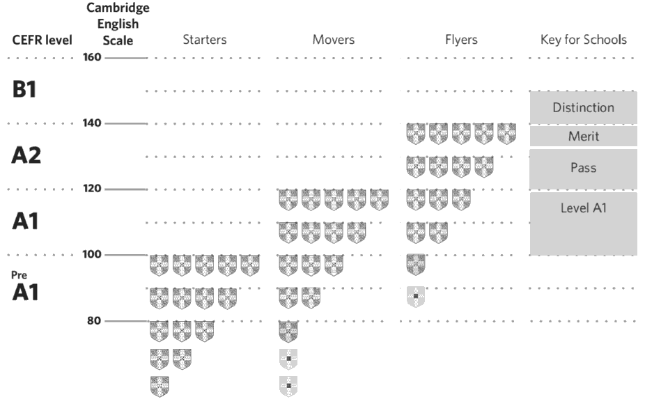 Tất cả thí sinh tham gia đều nhận được chứng chỉ mà không có đánh giá đạt hay không đạt. Trên chứng chỉ sẽ có biểu thi số khiên mà học sinh đó nhận được. Khiên được lấy biểu tượng từ các hiệp sĩ hoàng gia và sau này trở thành logo của Cambridge, giống như huy hiệu của sự chiến thắng. Số lượng khiên tối đa cho mỗi kĩ năng Nghe, Nói, Đọc & Viết là 5 khiên. Điểm tối đa của bài thi là 15 khiên (logo của Cambridge).