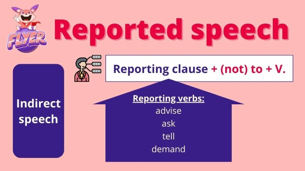Phần lớn câu yêu cầu (hay câu mệnh lệnh) thường không có chủ ngữ mà luôn mở đầu bằng một động từ nguyên thể để đi thẳng vào nội dung yêu cầu. Vì vậy, MĐĐTT trong câu yêu cầu gián tiếp thường bắt đầu với “to V”. Ta có cấu trúc câu yêu cầu gián tiếp cụ thể như sau: