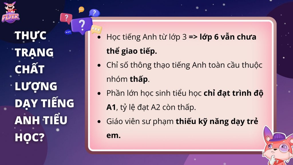 Tóm lại, chất lượng dạy tiếng Anh tiểu học đã và đang là mối quan tâm hàng đầu của giáo dục. Để đảm bảo học sinh sử dụng được tiếng Anh hàng ngày và sẵn sàng hội nhập, mỗi giáo viên cần hiểu rõ các yếu tố ảnh hưởng và chủ động tìm giải pháp phù hợp, cá nhân hóa. Kiến thức và sự sáng tạo của thầy cô chính là con tàu vững chắc giúp học sinh chinh phục tiếng Anh và vươn xa trong cuộc sống. FLYER chúc thầy cô luôn vững tin.