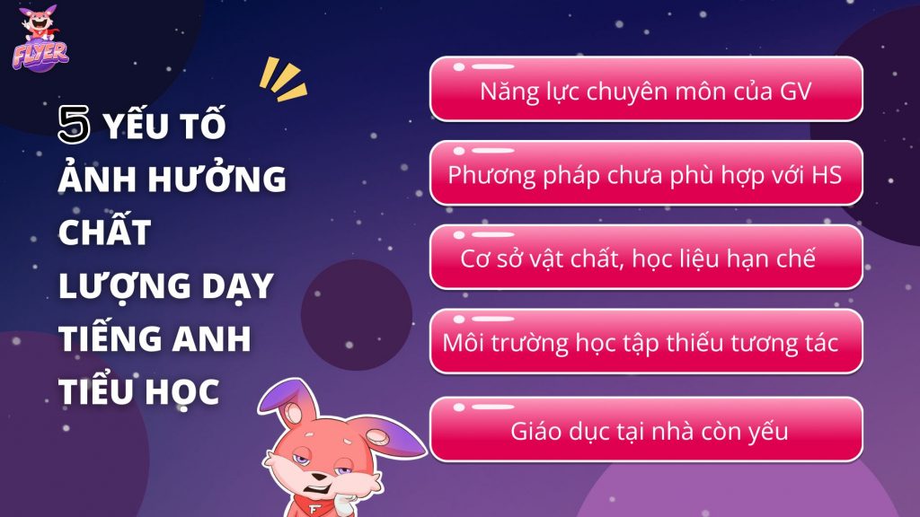 Chất lượng dạy tiếng Anh tiểu học có thể quyết định khả năng sử dụng ngôn ngữ của trẻ trong tương lai. Tuy nhiên, tình trạng học sinh bước vào cấp 2 nhưng vẫn chưa giao tiếp được cơ bản hoặc phát âm sai vẫn còn tồn tại. Để đạt được hiệu quả tốt nhất, nhiều yếu tố cần được xem xét và cải thiện. Vậy đâu là 5 yếu tố ảnh hưởng đến chất lượng dạy tiếng Anh tại các trường tiểu học? Mời thầy cô cùng FLYER tìm hiểu những yếu tố này và cách nâng cao hiệu quả dạy học tiếng Anh cho trẻ ngay trong bài viết dưới đây.