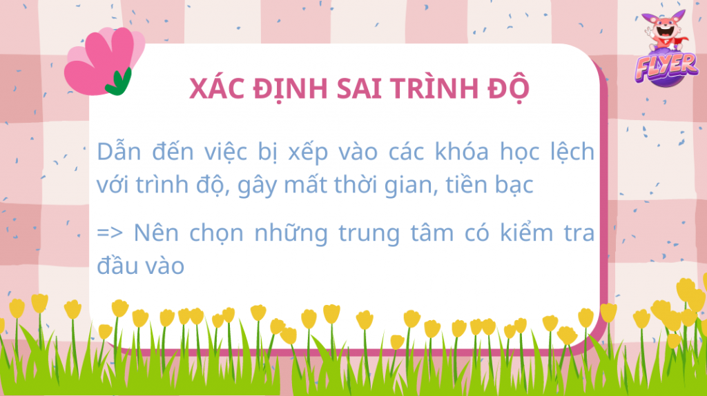 FLYER gợi ý bạn nên lựa chọn những trung tâm có kiểm tra năng lực đầu vào của học viên để xác định trình độ bản thân một cách chuẩn xác nhất. Đó cũng sẽ là căn cứ để bạn lựa chọn những khóa học và lộ trình phù hợp, từ đó có thể đạt được mục tiêu đã vạch ra.