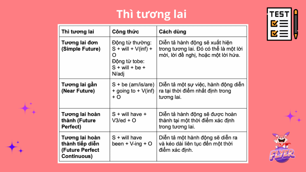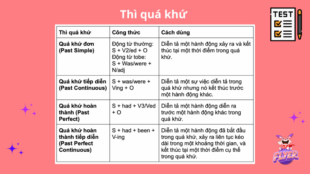 Dưới đây là tổng hợp sơ lược về cấu trúc và cách dùng của 12 thì tiếng Anh: