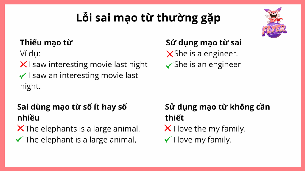 Vì thế, để tránh mắc những lỗi phổ biến này, bạn cần chú ý quy tắc khi sử dụng mạo từ “a”, “an, “the”. Bên cạnh đó, thường xuyên đọc lại và sửa lỗi trong bài viết của mình để phát hiện và điều chỉnh các lỗi liên quan tới mạo từ.
