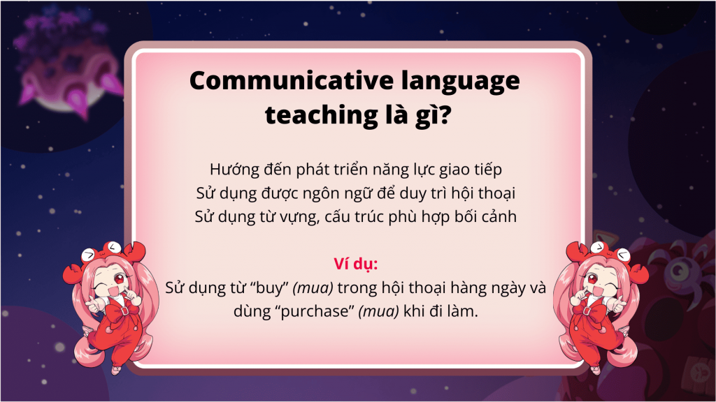 Communicative Language Teaching (CLT – Giảng dạy ngôn ngữ giao tiếp) là phương pháp hướng đến mục đích phát triển năng lực giao tiếp. Khi đó, người học sẽ biết cách sử dụng ngôn ngữ cho phù hợp với mục đích hoặc ngữ cảnh, duy trì được các cuộc hội thoại ngay cả khi hạn chế về trình độ. Do đó, trải nghiệm học tập hấp dẫn, thiết thực khi ứng dụng CLT rất được chú trọng.