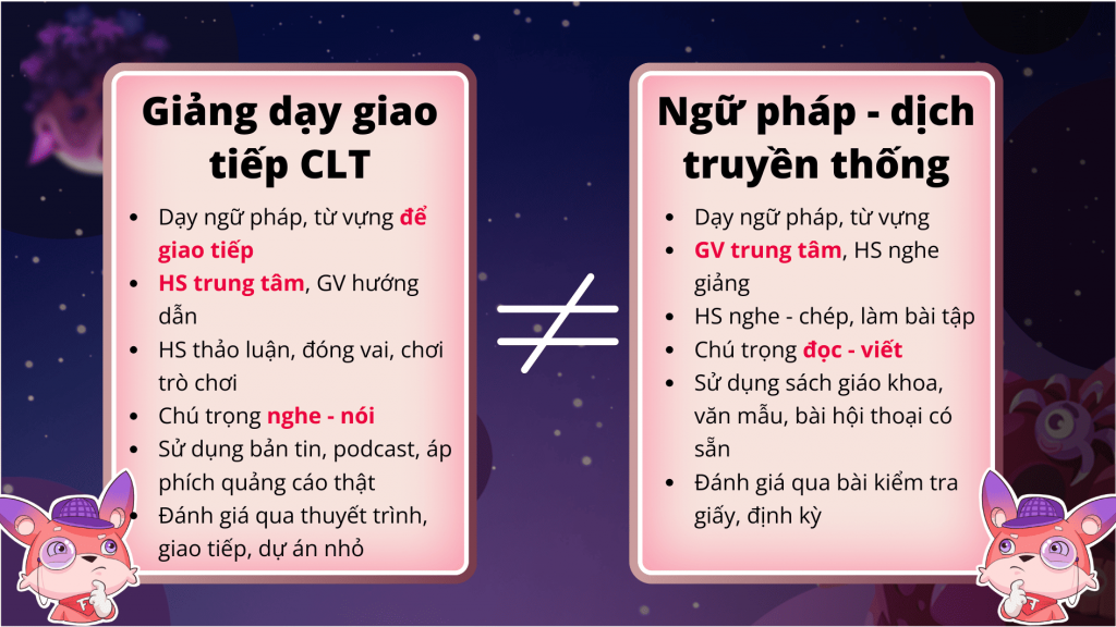 | Mục đích | Dạy đúng ngữ pháp, từ vựng, cấu trúc câu | Dạy cách sử dụng ngôn ngữ để giao tiếp |