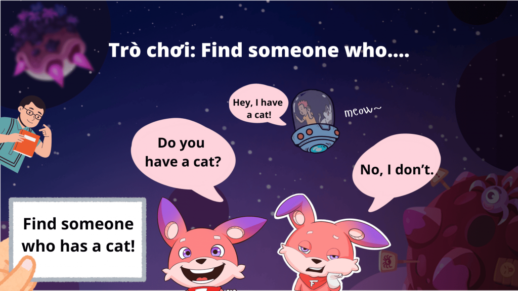 - Giáo viên phát các thẻ mà trong đó có ghi: “Find someone who has a cat (Tìm một bạn có nuôi mèo) hoặc Find someone who can cook (Tìm một bạn biết nấu cơm).
