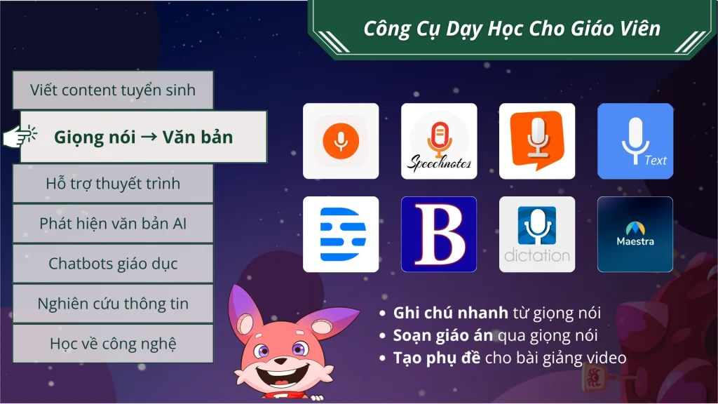 - Soạn giáo án, văn bản/ email qua giọng nói: Descript, Braina Pro, Dictation.io.