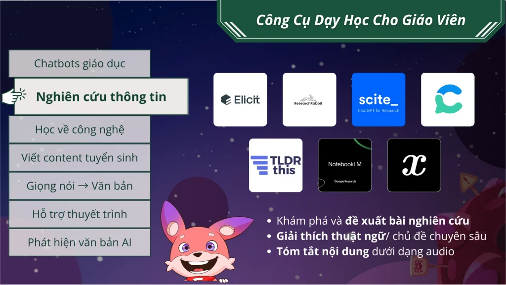 Trong quá trình giảng dạy, việc không ngừng cập nhật kiến thức mới và trau dồi các kỹ năng nghiên cứu thông tin là vô cùng cần thiết. Với các công cụ dưới đây, thầy cô có thể truy cập nguồn tài liệu uy tín, chất lượng và thực hiện các công việc nghiên cứu một cách nhanh chóng, dễ dàng, hiệu quả.