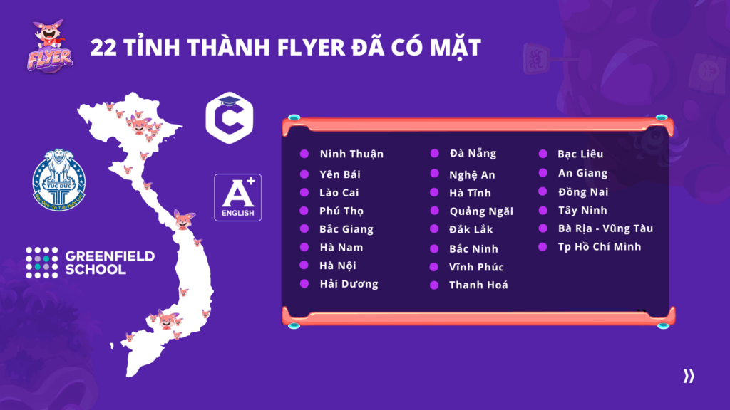 Tính đến cuối năm 2022, Phòng thi ảo FLYER đã được tích hợp vào chương trình học của nhiều trung tâm Anh ngữ và trường quốc tế trên khắp cả nước. Cụ thể, FLYER đã hợp tác với hơn 700 trung tâm và thầy cô, trong đó hợp tác trực tiếp với gần 200 đại sứ – đơn vị phân phối lớn nhỏ với độ phủ sóng trên khắp cả nước. Cụ thể, FLYER hiện đã có mặt tại 22 tỉnh thành như Ninh Thuận, Yên Bái, Lào Cai, Phú Thọ, Bắc Giang, Hà Nam, Hà Nội, Hải Dương, Đà Nẵng, Nghệ An, Hà Tĩnh, Quảng Ngãi,…