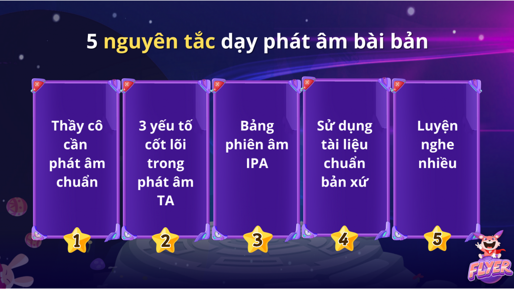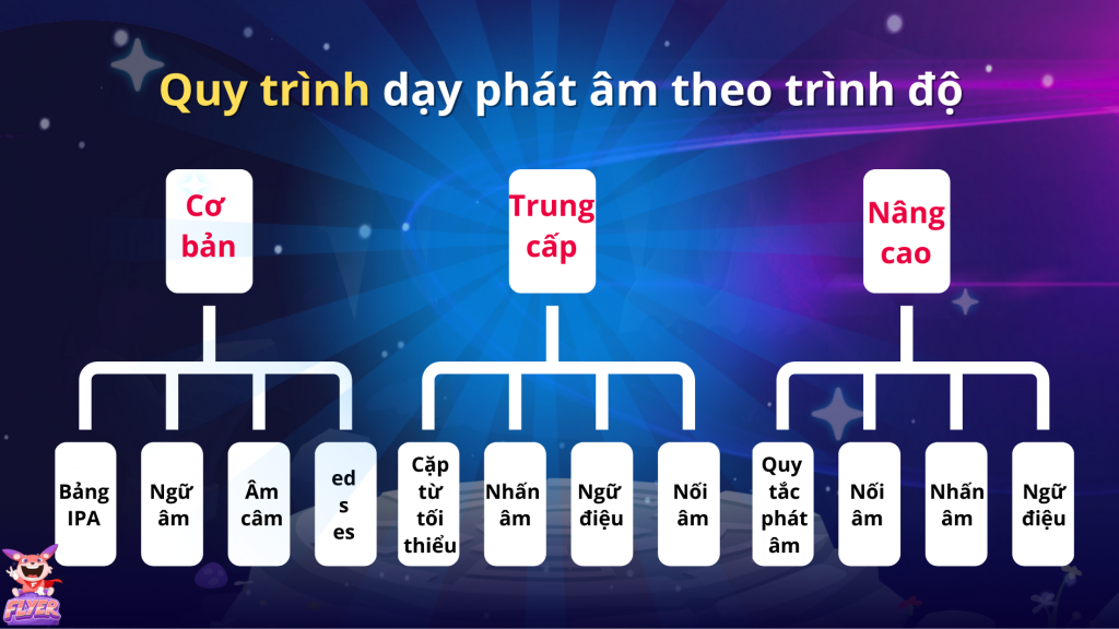 Dưới đây, FLYER tổng hợp quy trình dạy phát âm tiếng Anh chuẩn bản ngữ theo 3 cấp độ: Cơ bản – Trung cấp – Nâng cao, nhằm giúp thầy cô và học viên giảm thiểu khó khăn trong quá trình dạy-học.