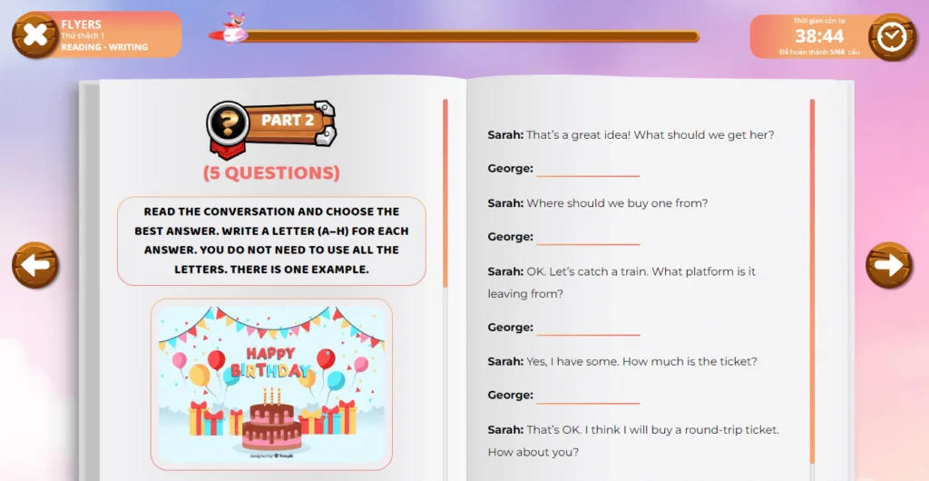 Các con cũng có thể trải nghiệm full bài thi Flyers miễn phí tại Phòng thi ảo với hơn 200+ đề luyện thi Flyers Cambridge (đầy đủ các phần thi Listening, Reading & Writing và Speaking) cho con trải nghiệm toàn bộ bài thi đầy đủ một cách chân thực nhất.