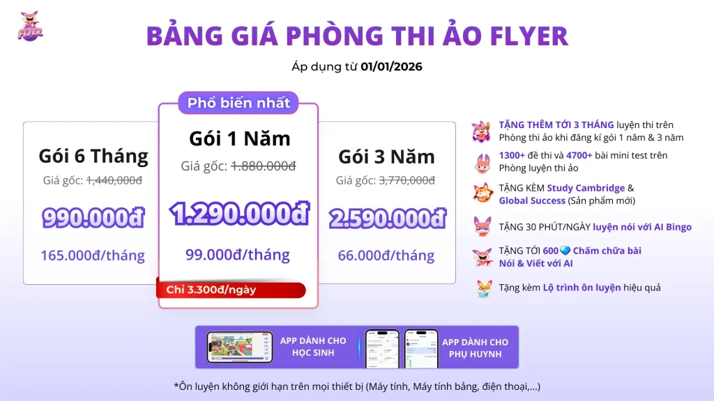 Bước sang năm mới, FLYER cập nhật biểu phí mới cho các gói tài khoản, mang đến trải nghiệm học tối ưu hơn cho học sinh trên Phòng Thi Ảo. Cụ thể: