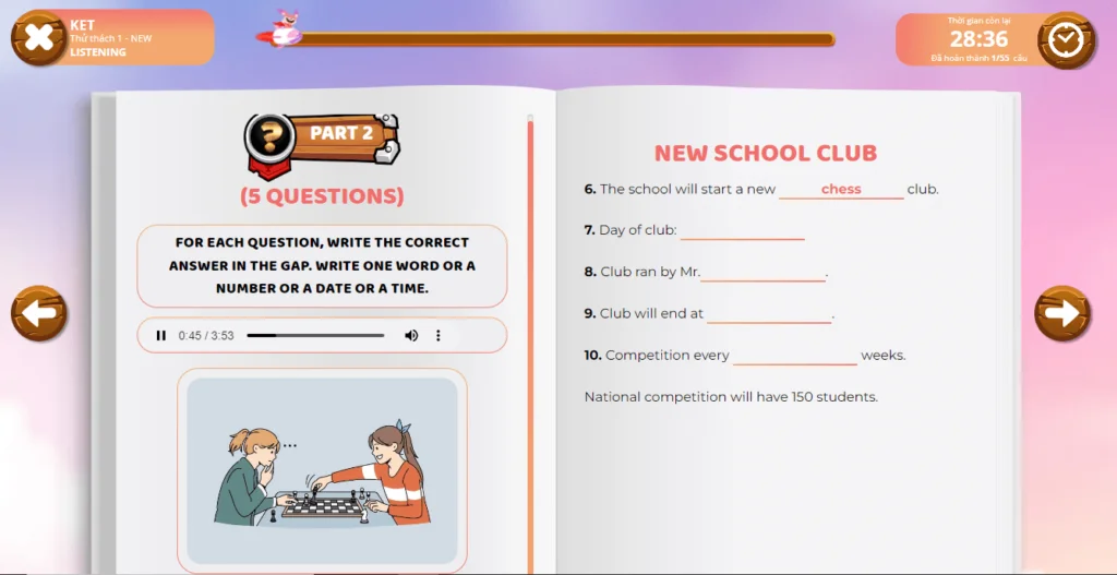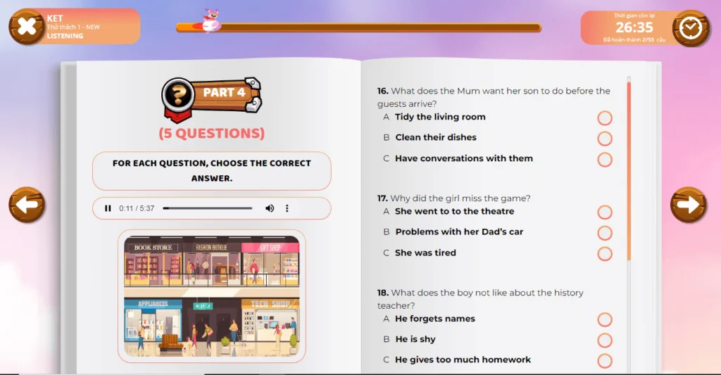 Bài thi Nghe KET Cambridge có 5 phần. Với mỗi phần, thí sinh sẽ nghe một đoạn ghi âm và trả lời một số câu hỏi. Thí sinh được nghe 2 lần mỗi đoạn.