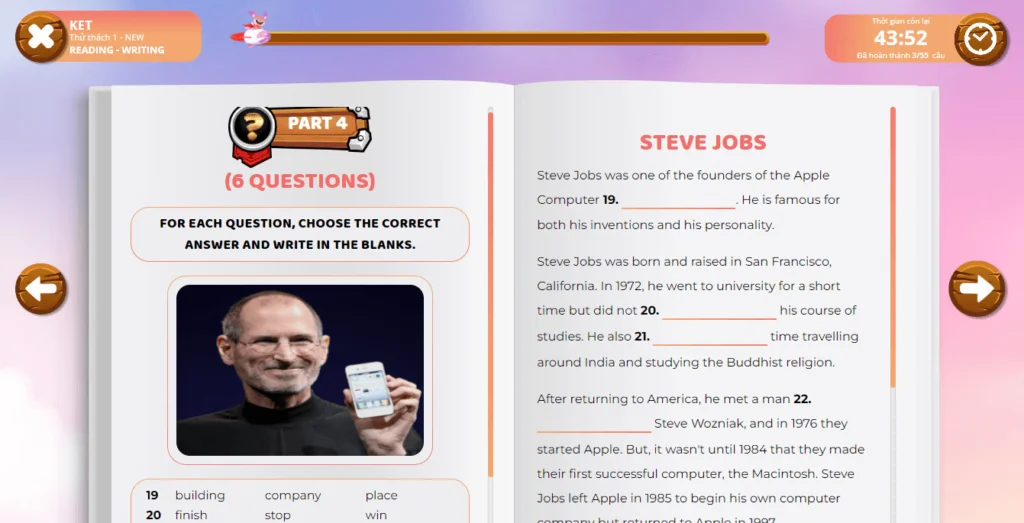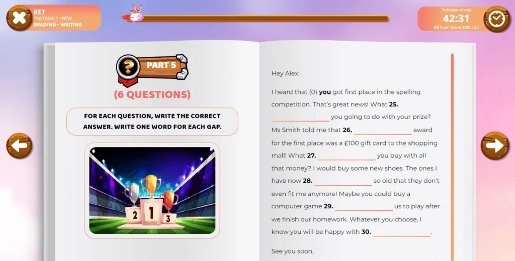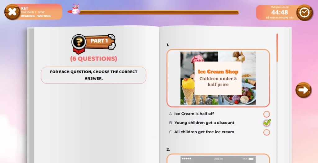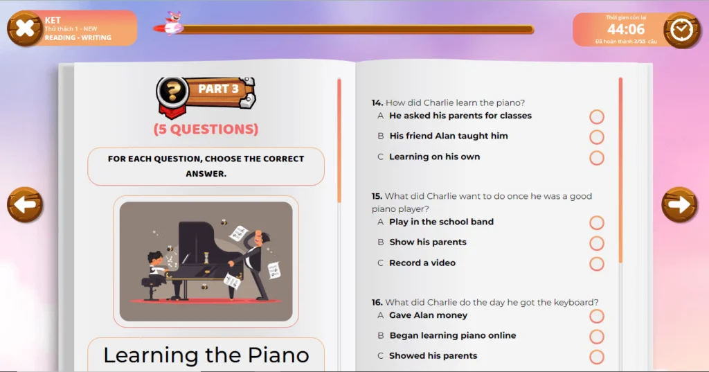 Trong Part 3 bài thi KET Cambridge, thí sinh đọc 1 văn bản dài hơn (một bài báo hoặc tạp chí) và hoàn thành 5 câu hỏi trắc nghiệm, mỗi câu có 3 phương án trả lời.