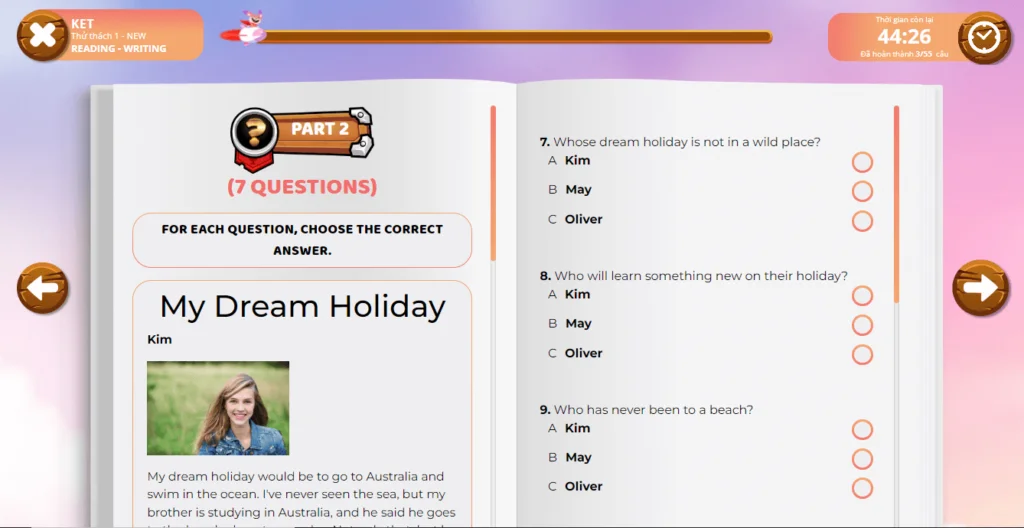 Trong Part 2 bài thi KET Cambridge, thí sinh đọc 7 câu hỏi và 3 đoạn văn có cùng chủ đề, sau đó chọn đáp án đúng cho mỗi câu hỏi.