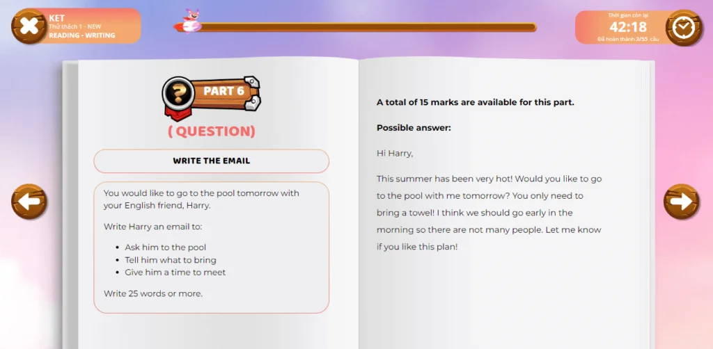 - Thí sinh không nên dành quá nhiều thời gian cho phần Viết. Thời lượng gợi ý cho cả Part 6 và Part 7 trong bài thi Đọc và Viết KET Cambridge là 20 phút