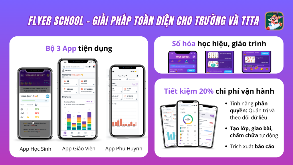 FLYER SCHOOL tự hào là giải pháp tối ưu thời gian, năng suất cho 700+ đơn vị giáo dục uy tín như: trường liên cấp Greenfield, trường Tuệ Đức, trung tâm Aplus, trung tâm Evas,…Với 5.5 triệu+ lượt truy cập trang và 590,000 học sinh ôn luyện hàng tháng.