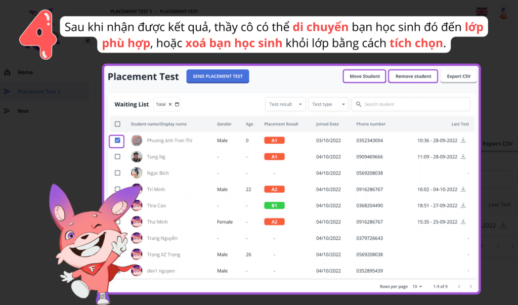 Sau khi đã có kết quả xếp hạng trình độ tiếng Anh của từng học sinh, thầy/ cô có thể di chuyển học sinh đó qua lớp học phù hợp với trình độ bằng 1 thao tác đơn giản là click chuột vào “Move Student’.